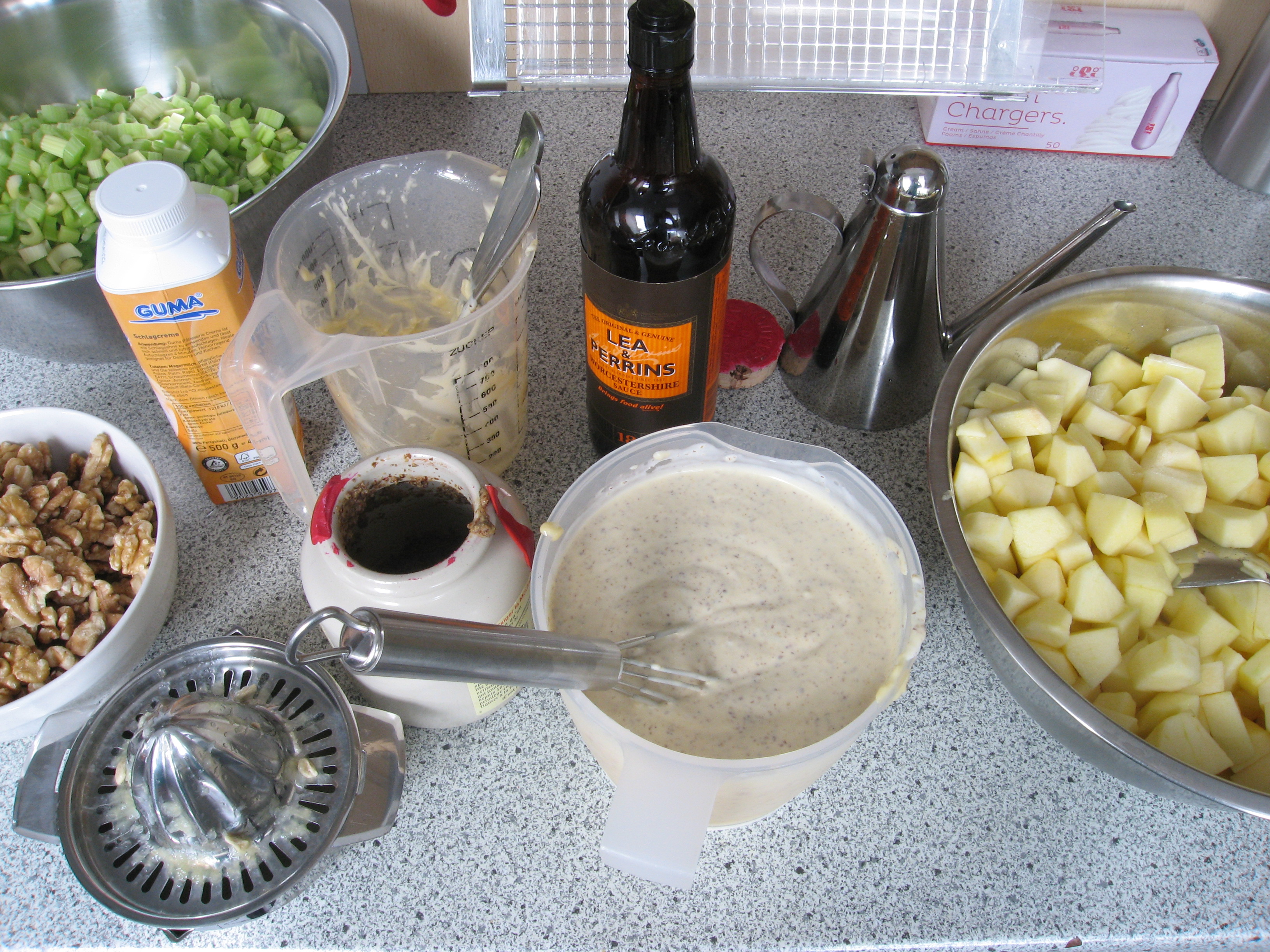 Wer den Blog-Eintrag kurz zuvor gesehen hat, bzw. den Einkauf, der dort auf dem Tisch steht, wird sich wundern, was man mit so viel Äpfeln und Stangensellerie anfangt (die Walnüsse sieht man nicht). Ganz einfach. Man benötigt sie für einen Waldorf-Salat. Und zwar in rauhen Mengen, wenn man daran zu Mittag eine ganze Arbeitswoche lang knabbern will.