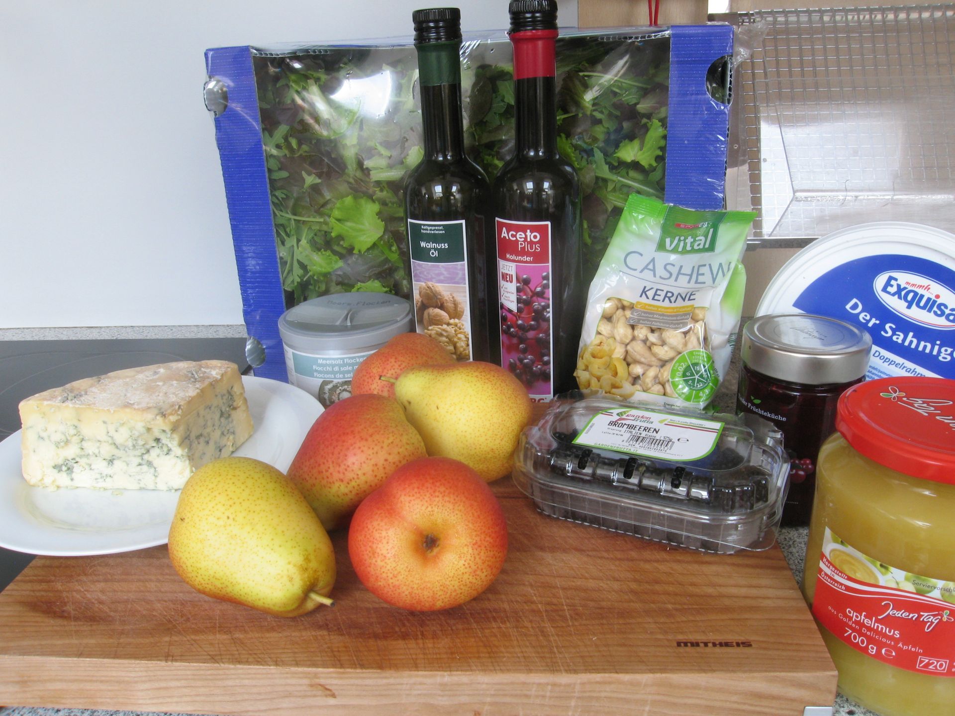 Birne und Blauschimmelkäse sind eine beliebte Kombination. Im August sind heimische Birnen eher noch nicht erhältlich und man muss auf die südafrikanische Sorte „Forelle“ zurückgreifen. Was nicht im Geringsten von Nachteil ist: Das Fleisch ist fest wie Butter und schmeckt so süß ohne wassrig zu sein, was es zum idealen Begleiter von Salat macht.
