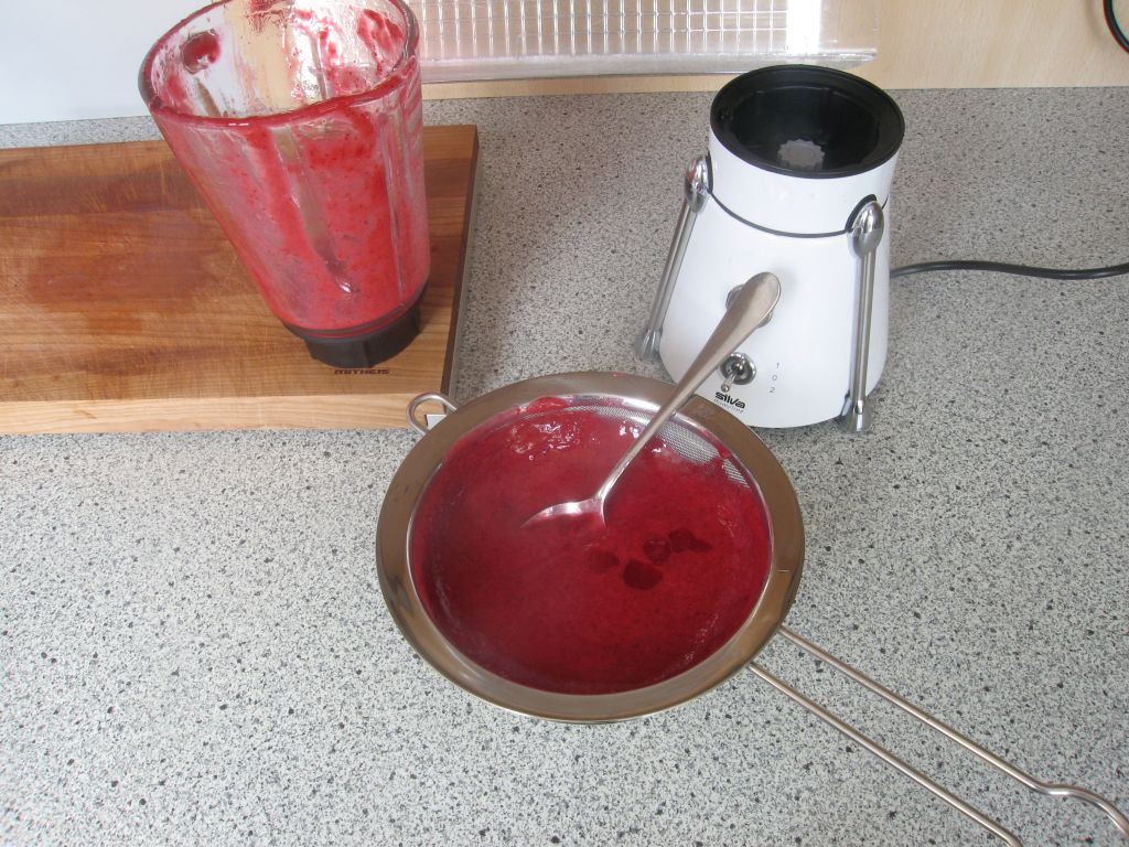 Durch ein Sieb streichen Die Masse durch ein Sieb in die iSi 0,5 Flasche streichen. 1 Sahnekapsel draufschrauben und kräftig schütteln.