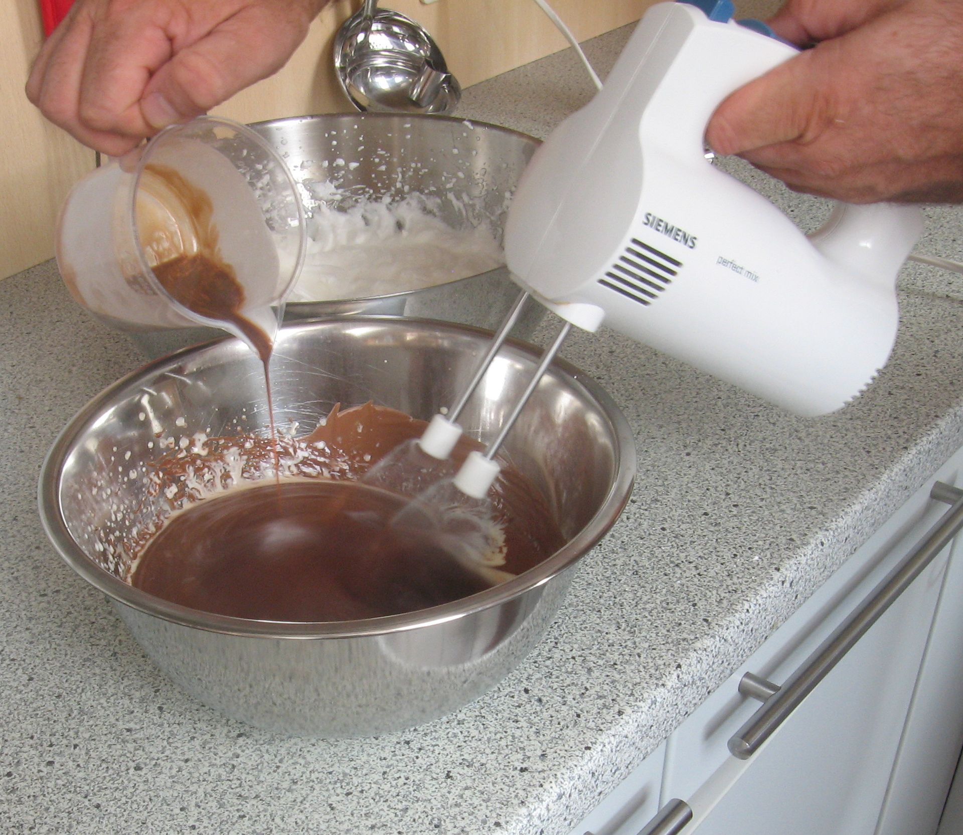 - Das Obers, den Likör und den Zucker verrühren und in den Schokoschmelz mixen.