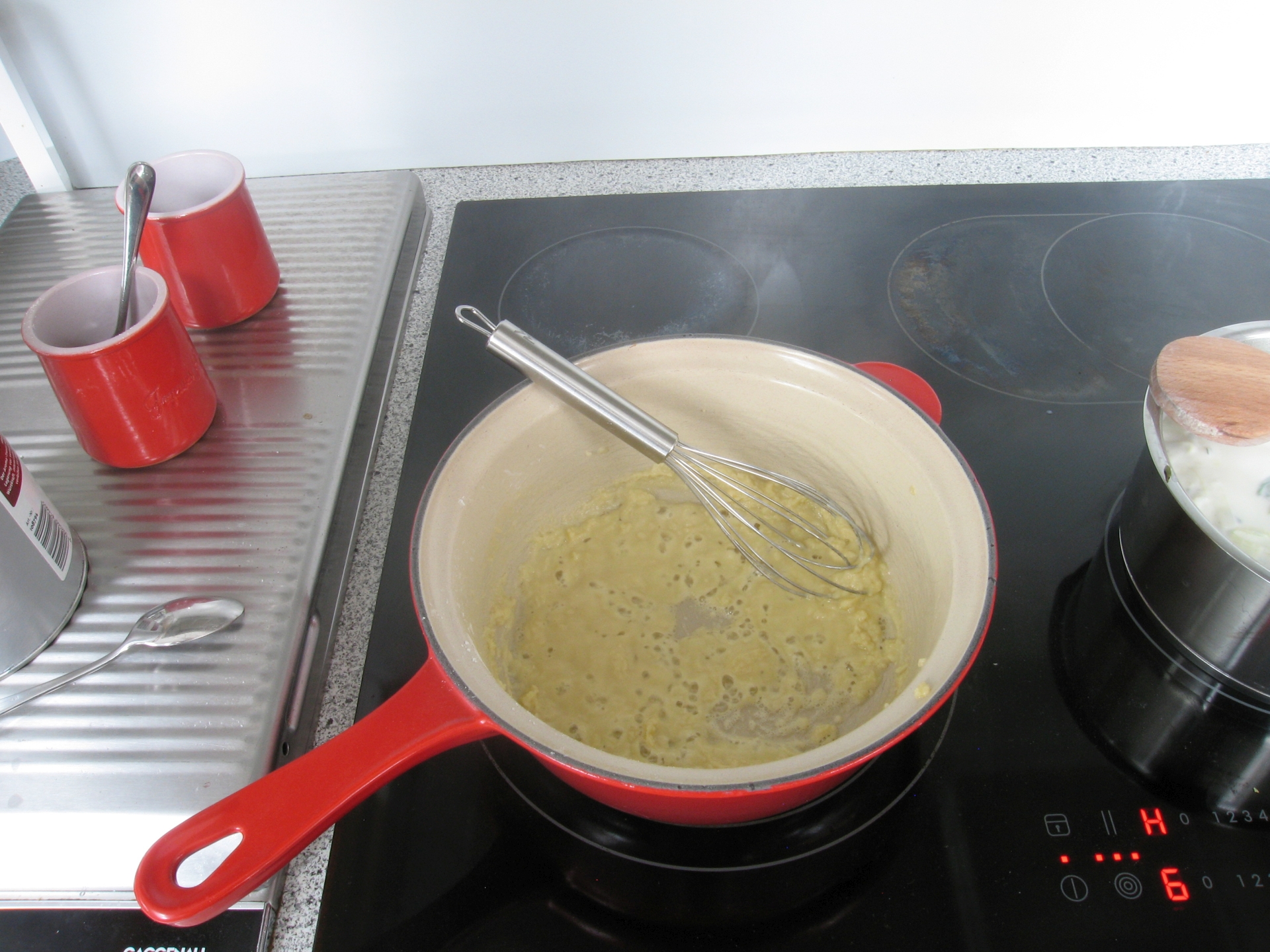 - Den abgekühlten Roux mit der heißen Gewürzmilch aufgießen, mit dem Schneebesen durchrühren und aufkochen.