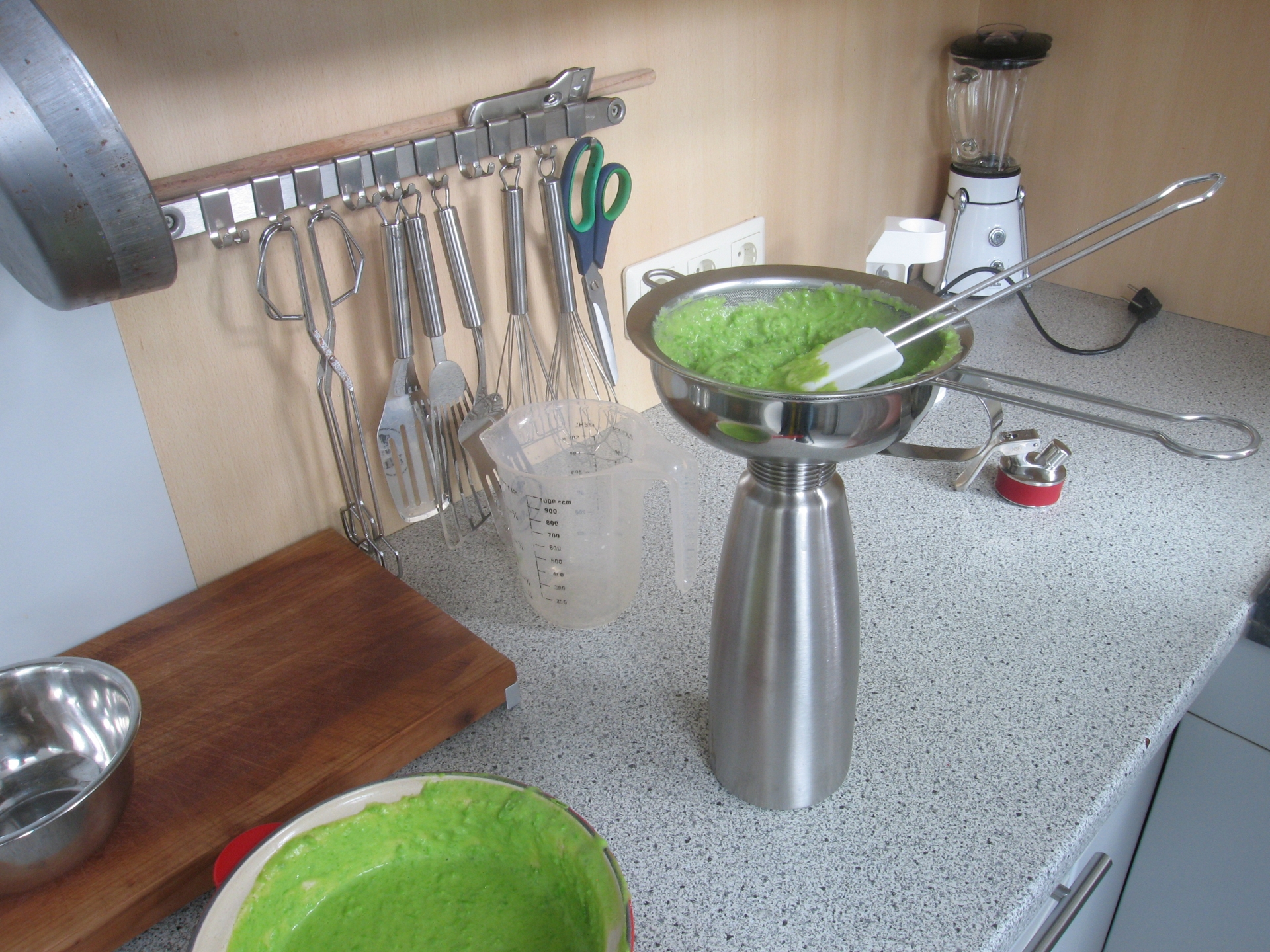 Die Erbsenmasse wird in die iSi-Fasche eingefüllt. Durch ein feines Sieb abseihen.