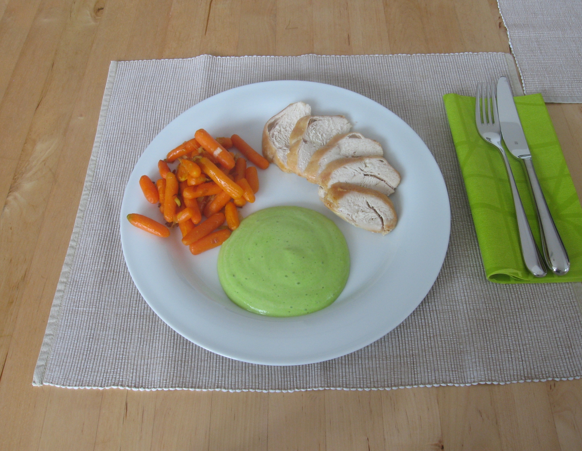 Dazu passen aufgeschnittene, gebratene Hühnerbrüste und in Lauch sautierte Baby-Karotten.