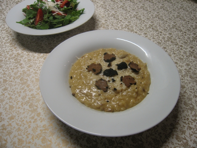 - Den Topf vom Herd nehmen und 80 g Butterflocken und Parmesan nach Belieben einrühren. Auf warme Teller servieren und die Trüffel drüber hobeln.