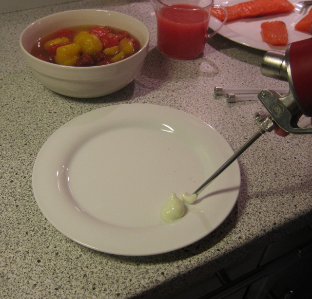 Mit den beiden Vertretern der Molekularküche – Xanthan und ProEspuma – bin ich voll zufrieden. Das Xanthan hat es erleichtert, das Sorbet herauszukratzen und geschmeidig zu machen, ganz ohne Pacosieren. Das ProEspuma hat den Gurkenschaum stabilisiert, ansonsten war es unauffällig. Ich hätte nie geahnt, dass dieses Gericht aus der Molekularküche stammt.