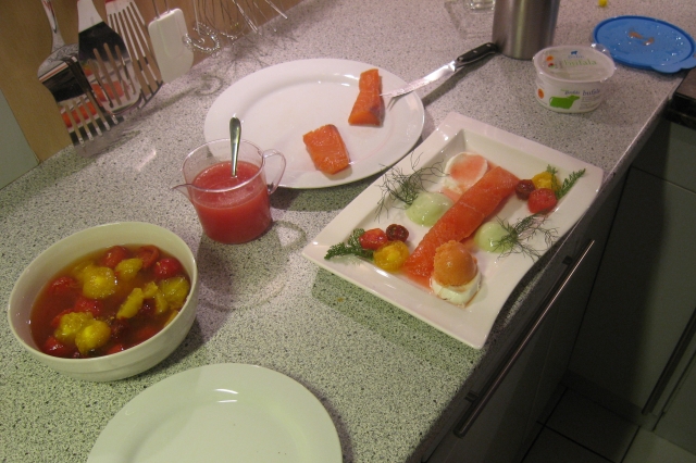 Das Rezept wurde schon im Beitrag „Lachs auf Tomate (Teil 1)“ besprochen. Heute ging es nur mehr ans Anrichten. So gesehen ein ideales Gericht, wenn Freunde kommen. Dazu getoastete Baguette, ein famoser Wein dazu und los geht’s!
