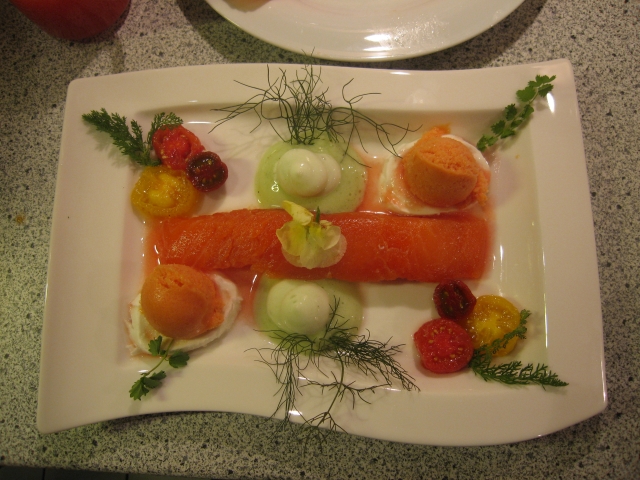 Der Gurkenschaum schmeckt so gurkig, wie es kein Gurkensalat schafft. Der Schaum bringt mehr Geschmack, ganz klar. Das Tomatensorbet ist so erfrischend wie Tomaten aus Nachbars Garten. Die eingemachten Tomaten waren ein Gedicht. Der Lachs obwohl nicht gegart war genießbar, nein, genussvoll. Danke, Walter Triebl.