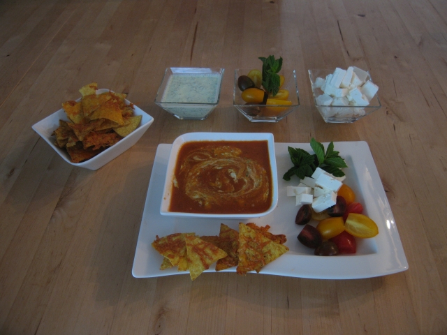 Das Rezept sieht auch noch Nachos und Gemüse mit Feta vor. Wir wollten nur eine geschmackvolle Tomatensuppe haben. Der Koriander und die Minze haben es uns angetan. Doch dann haben wir es uns anders überlegt und dazu gemacht: Nachos bestreut mit Cheddar, im Backrohr angeschmolzen. Kleine, rohe Tomatenhälften. Schafkäse und ein Minze-Joghurt abgeschmeckt mit Limette und Salz.