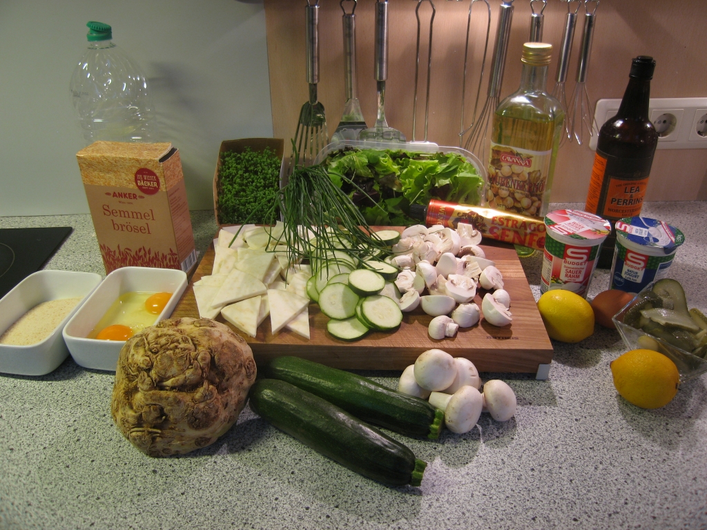 Man nehme Zucchini, Sellerie und Champignons und paniere sie. Und mache genug Mayonnaise und leite sie dreimal ab.