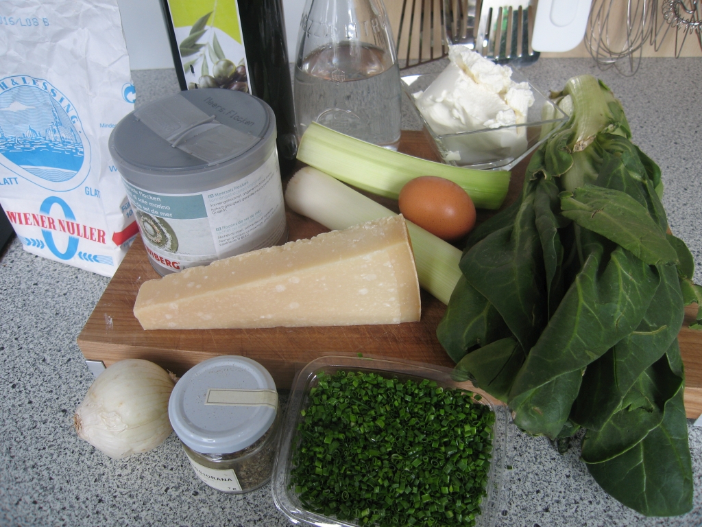 - In eine feuerfesten Form Zwiebel, Lauch und blanchiertes, gehacktes Mangold mit Ricotta und Parmesan, Ei, Salz, Pfeffer aus der Mühle und Majoranblättern und geschnittenen Schnittlauch mischen und mit Olivenöl abschmecken.