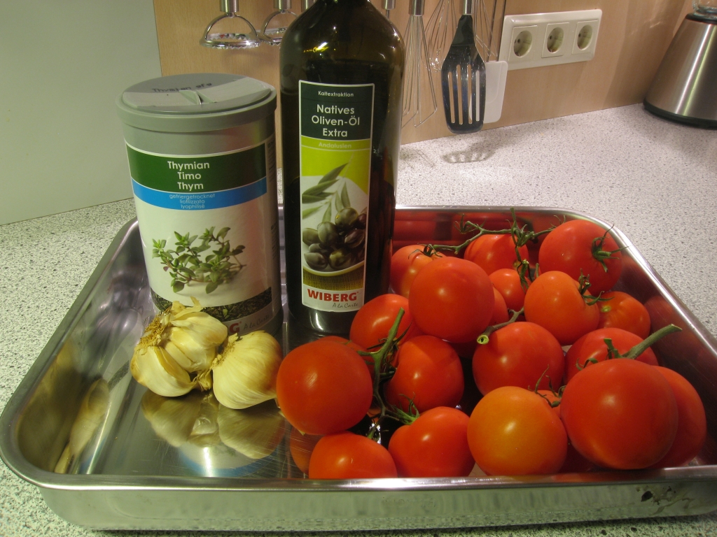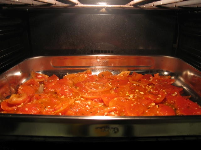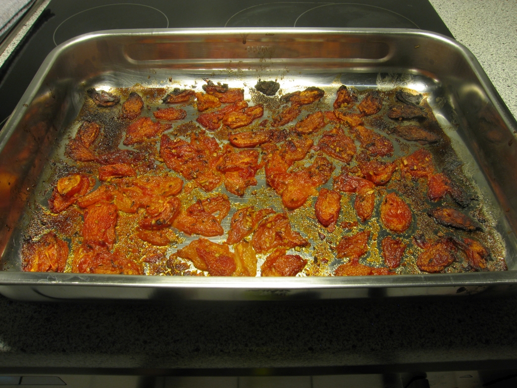 Die Tomaten werden im Backrohr getrocknet. Ab und zu öffnet man die Backrohr-Tür und ein unvergleichlicher Duft entströmt, der einen sicher macht: Essen ist nur das halbe Vergnügen.