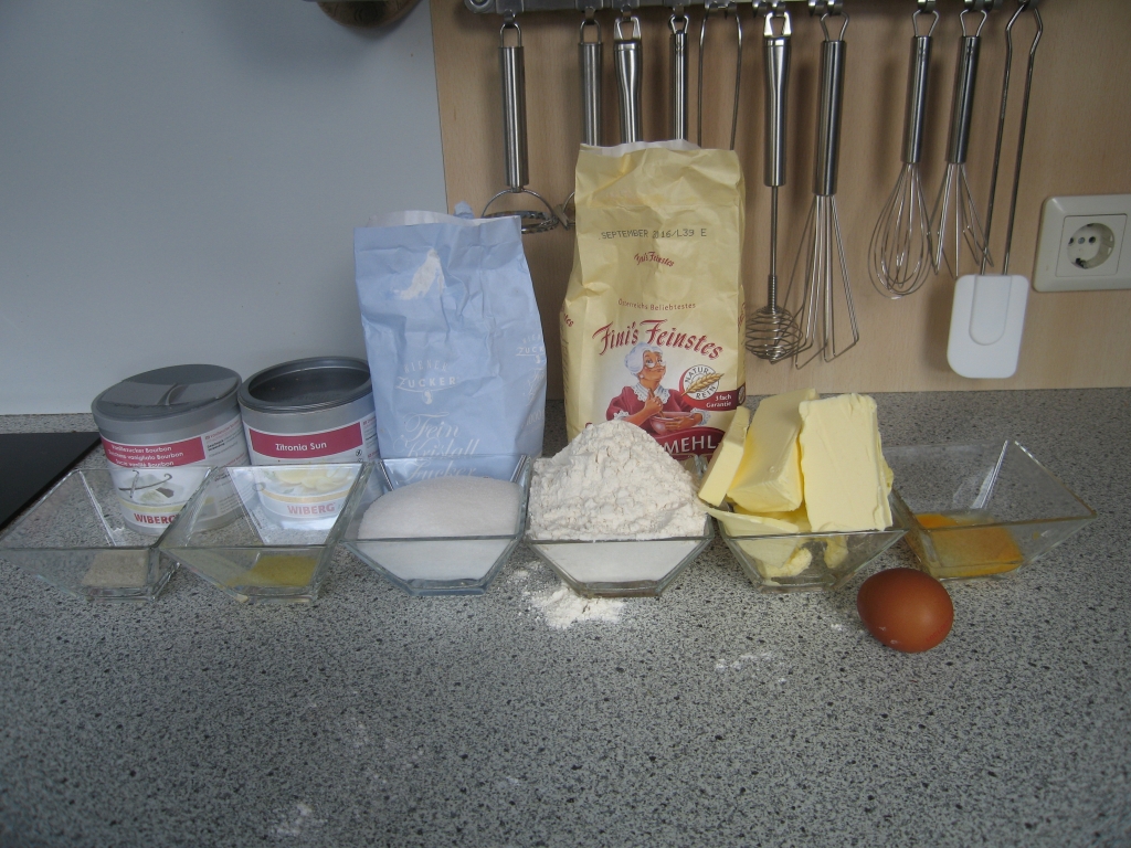 - Einen Teig machen: Vollei mit Bourbon-Vanillezucker, Zitronat und Salz verrühren, mit Butter und Kristallzucker mischen. Mehl zugeben, kurz mischen.