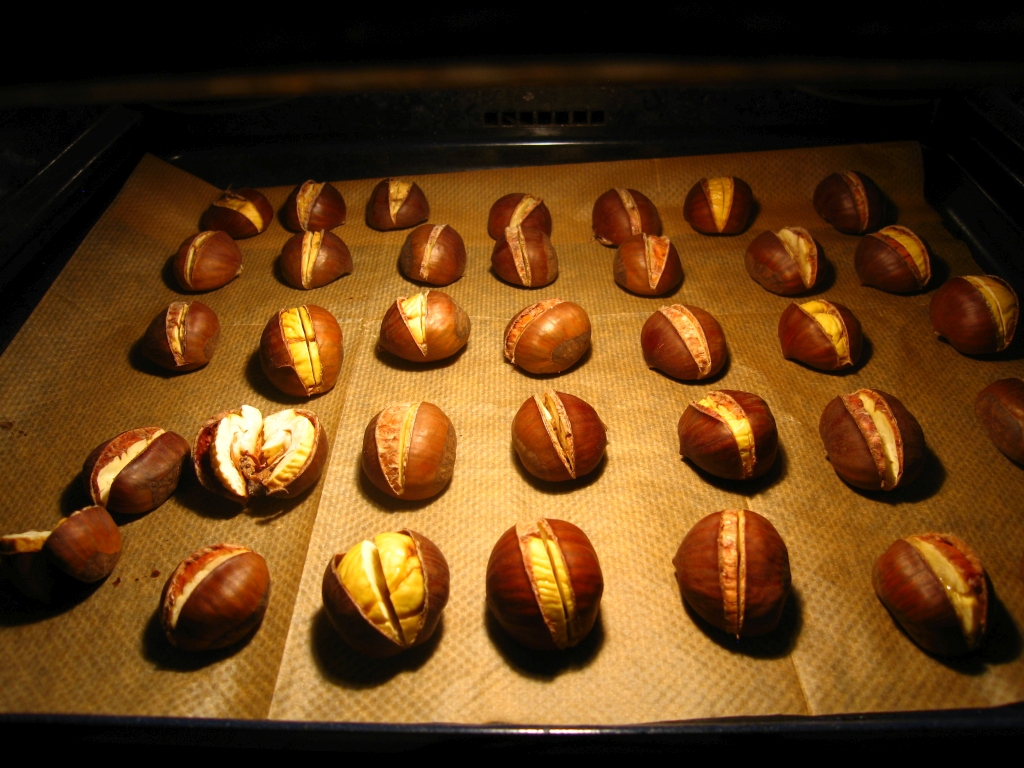 - Die Kastanien einritzen, auf ein Backblech auslegen und bei 200 Grad im Backrohr 20 Minuten garen lassen.