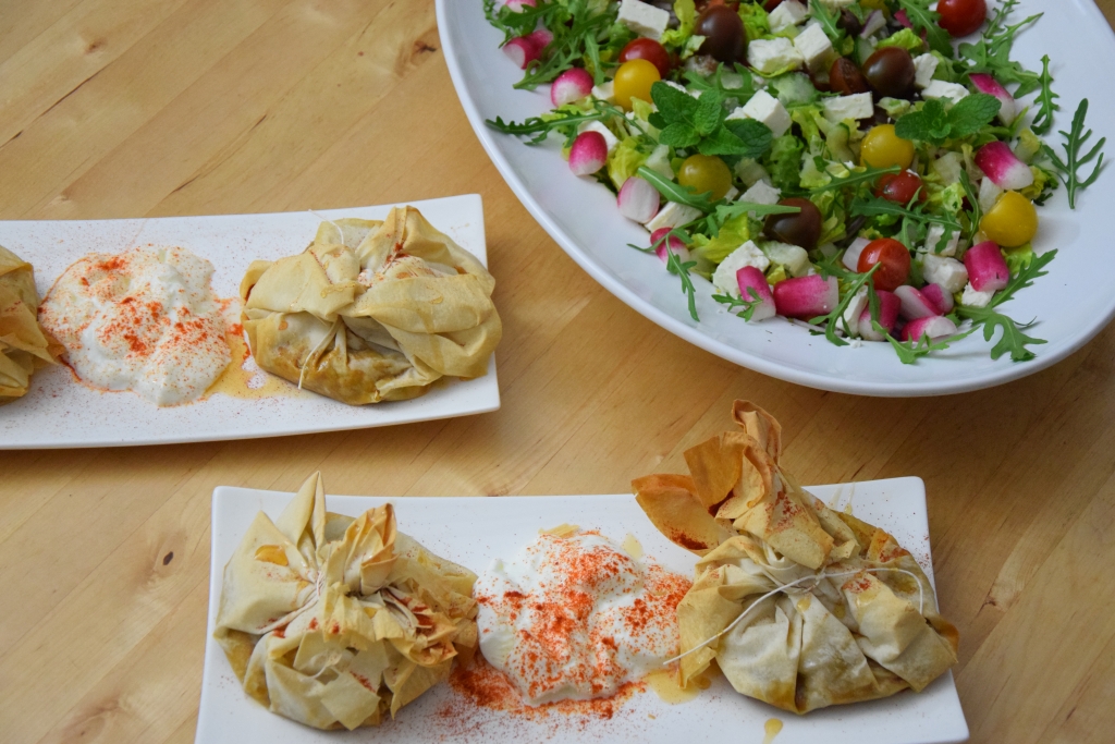 - Filoteigblatt einmal zusammenfalten und darauf in die Mitte einen Teil der Mischung legen. Zu einem Säckchen mit Küchengarn zusammenbinden. In einer Pfanne mit wenig Olivenöl anbraten, dann im Backrohr braten bis es goldbraun ist.