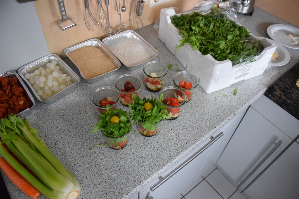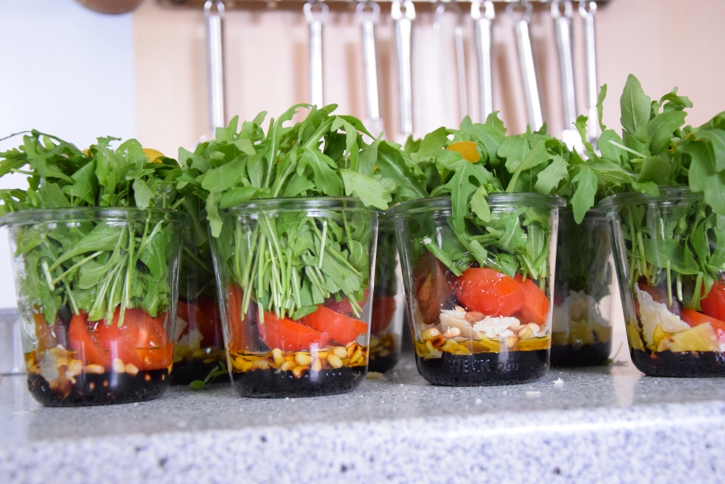 - In einem Weckglas Olivenöl, Aceto Balsamico, Parmesanspäne, Pinienkerne, Tomatenstücke und Rucola einfüllen.