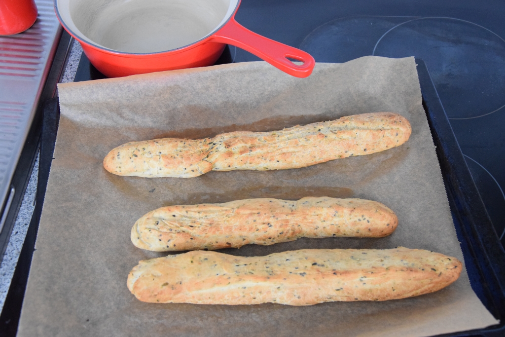 - Einen Focaccia-Teig machen, länglich auslegen und im Backrohr herausbacken. Auskühlen.