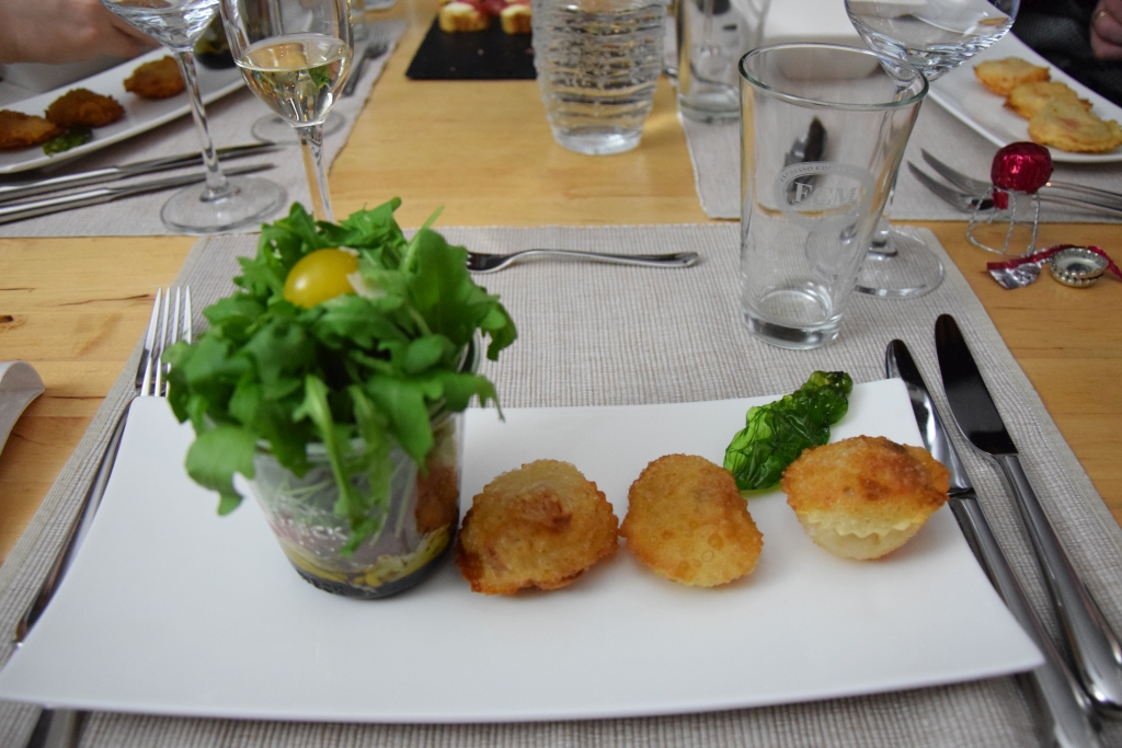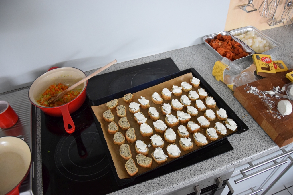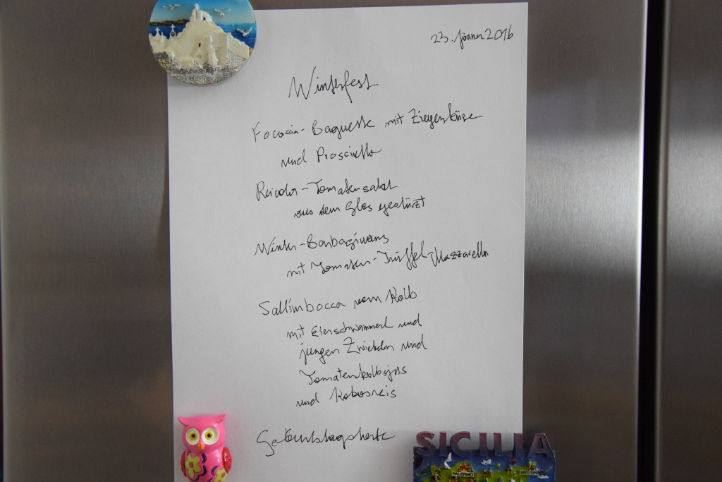 Das Winterfest: Focaccia-Baguette mit Ziegenkäse und Prosciutto, Rucola-Tomatensalat aus dem Glas gestürzt, Winter-Barbagiuans mit Tomaten-Trüffel-Mozzarella, Saltimbocca vom Kalb mit Eierschwammerl und jungen Zwiebel, Tomatenkalbsjus und Kokosreis.