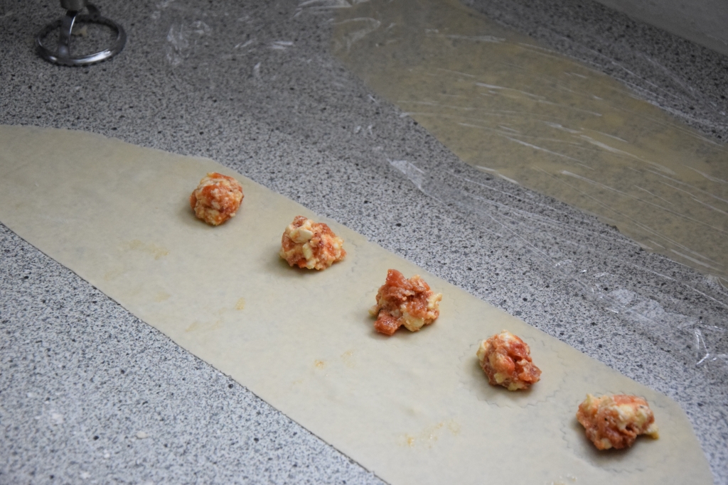 - Die Fülle in Abständen auf den Teig placieren, Teig darüber schlagen, rundherum festdrücken, mit einer runden Form ausstechen.