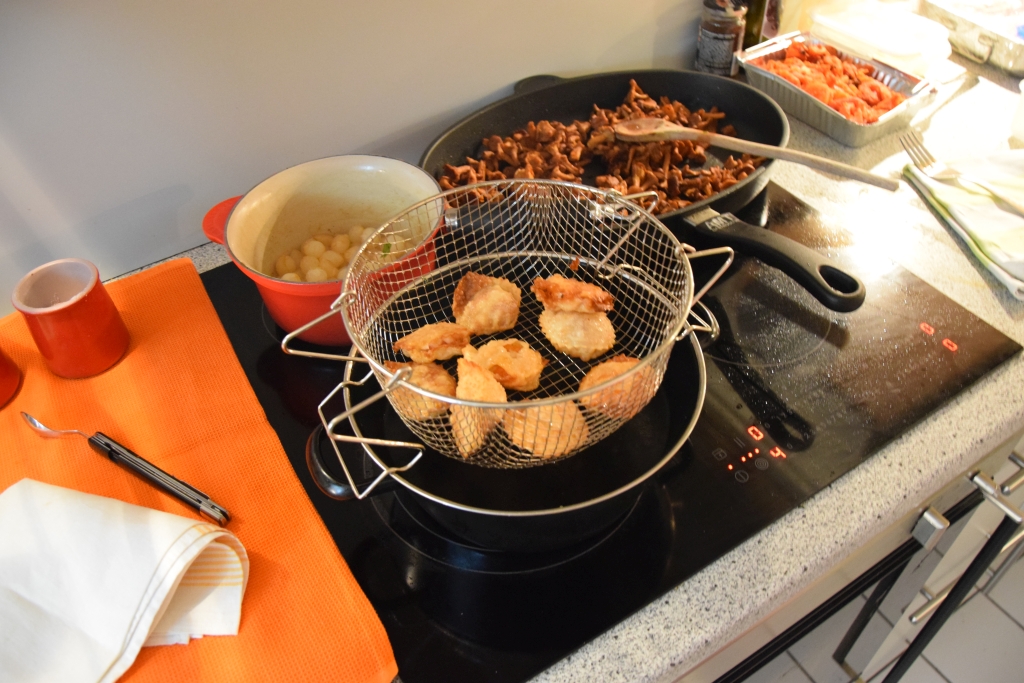 - In Frittieröl bei 150 Grad frittieren, Küchenrolle, S&P.