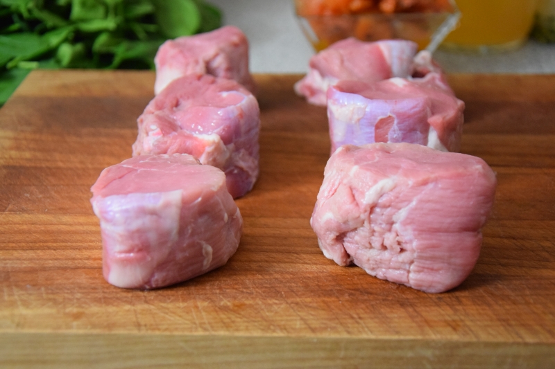 - Die Kalbsmedaillons in einer Pfanne mit erhitztem Olivenöl auf allen Seiten anbraten. Dann Temperatur auf mittlere Hitze zurück und einen Zweig Thymian und zerdrückte Knoblauchzehen dazu und von beiden Seiten 4 Minuten garen. Warm halten auf einem Teller mit Alufolie bedeckt.