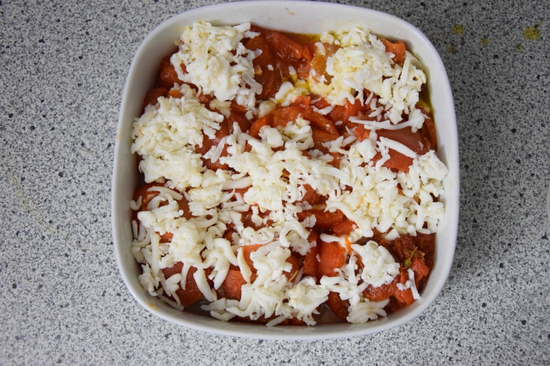 - Von den gehäuteten Tomaten die Kappe großzügig abschneiden und das Innere herausnehmen. Mit Salz und Zucker bestreut sowie mit zerdrückten Knoblauchzehen bei 170 ° Grad eine halbe Stunde lang ins Backrohr schieben.