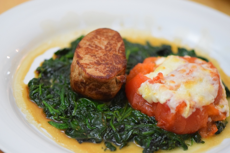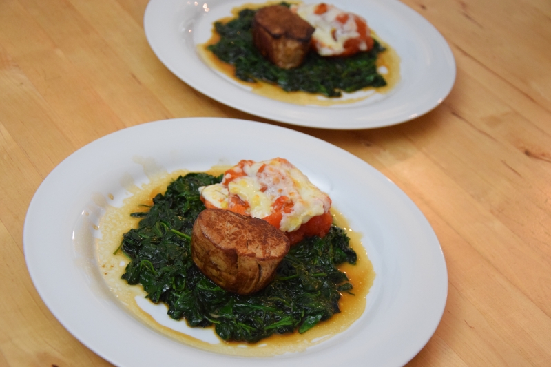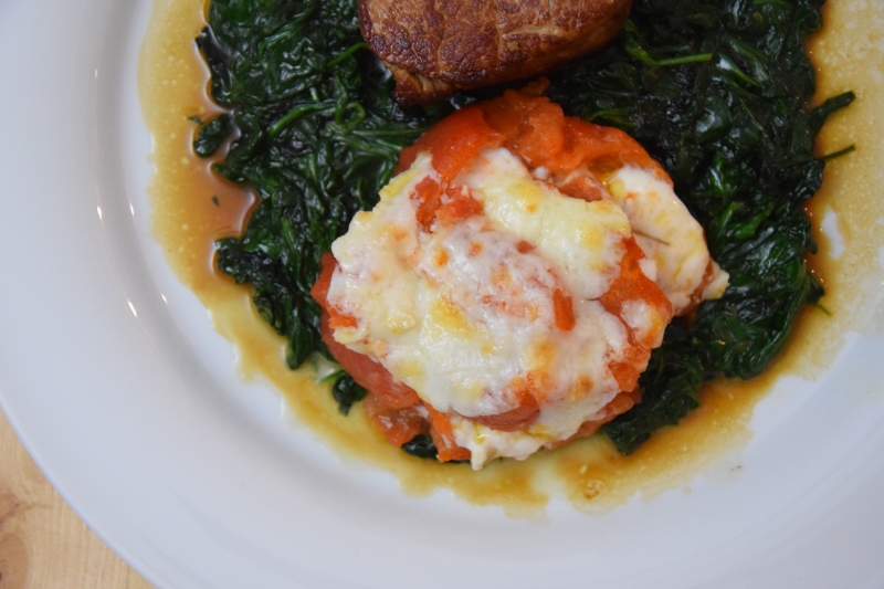 - Anrichten: Auf einem Bett von Spinat die Kalbsmedaillons und Tomaten anrichten. Mit Sauce rundherum beträufeln.
