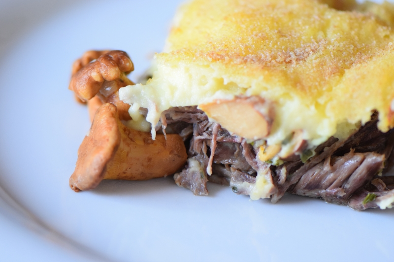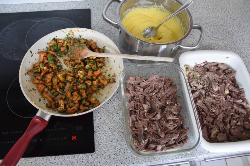 In einer Auflaufform zuerst das zerzupfte Fleisch 2 cm hoch aufschichten, dann die Eierschwammerl drauflegen und darüber den Kartoffelschnee legen und mit Semmelbrösel bestreuen.
