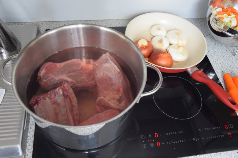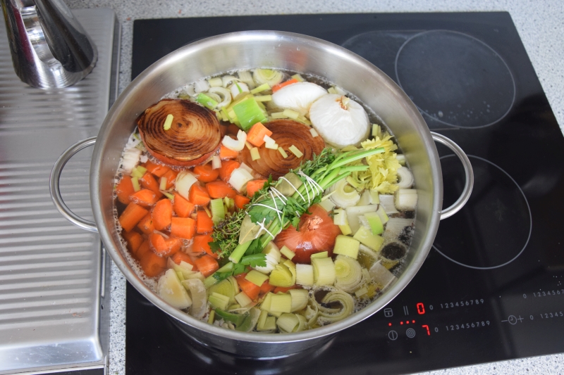 Das Fleisch im Ganzen in einen großen Suppentopf legen, mit eiskaltem Wasser auffüllen und erwärmen. Just, wenn es zu kochen beginnt, abseihen, um den Schaum loszuwerden, und die ganze Prozedur noch mal. Das Gemüse hinein, die Zwiebelhälften dazu mit den Gewürznelken bestückt, Pfefferkörner und ein Bouquet Garni (Lorbeerblatt, Thymian, Petersiliestängel), sowie reichlich Salz. 6 Stunden köcheln lassen, sagt Ducasse. Wir haben es in 3 Stunden geschafft.