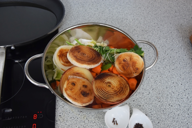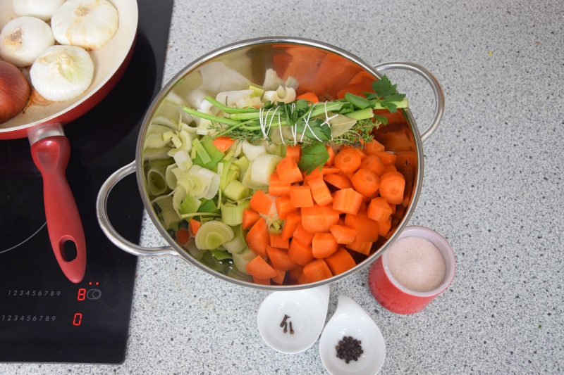Die Selleriestangen, Lauch und Karotten vorbereiten. Die Zwiebel halbieren und mit der Schale in einer Pfanne ohne Fett anbräunen.