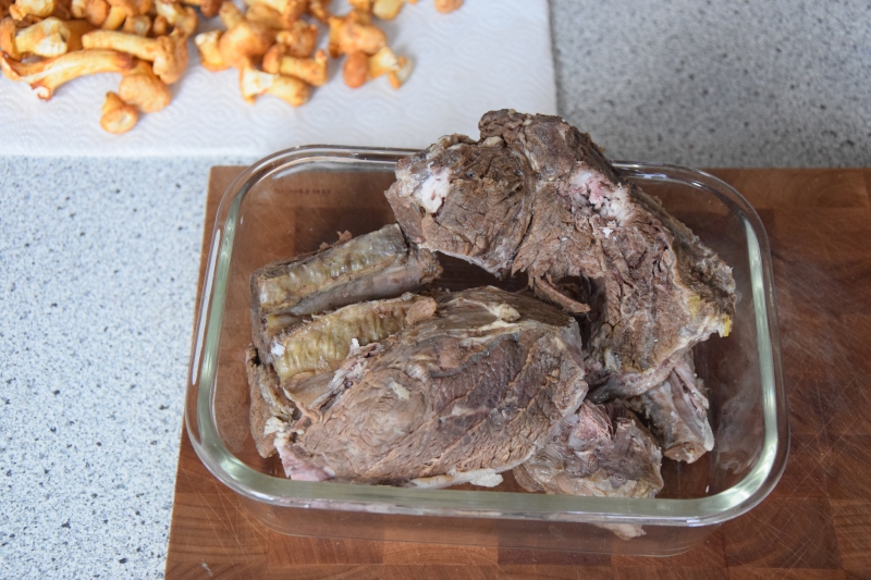 Dass wir das nicht einmal Rostbraten nennen, hat seinen Grund. Denn wir haben statt Rostbraten (Hochrippe) ein anderes Fleisch genommen. Für gekochtes Fleisch ist uns ein Rostbraten viel zu schade. Es wird ja auch noch zerzupft. Also kauften wir Beiried, Beinfleisch und Hinteres. Ducasse nimmt Hochrippe, Schulter und Hüfte.