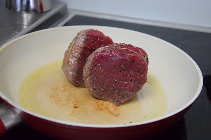 Die Tournedos salzen und pfeffern. Olivenöl in einer Bratpfanne erhitzen und das Fleisch rundherum anbraten. Zuerst auf den schmalen Seiten, dann auf den Flächen. Ein walnussgroßes Stück Butter dazu fügen und die Tournedos mit Butter beträufeln. 10 Minuten garen, dann ruhen lassen.
