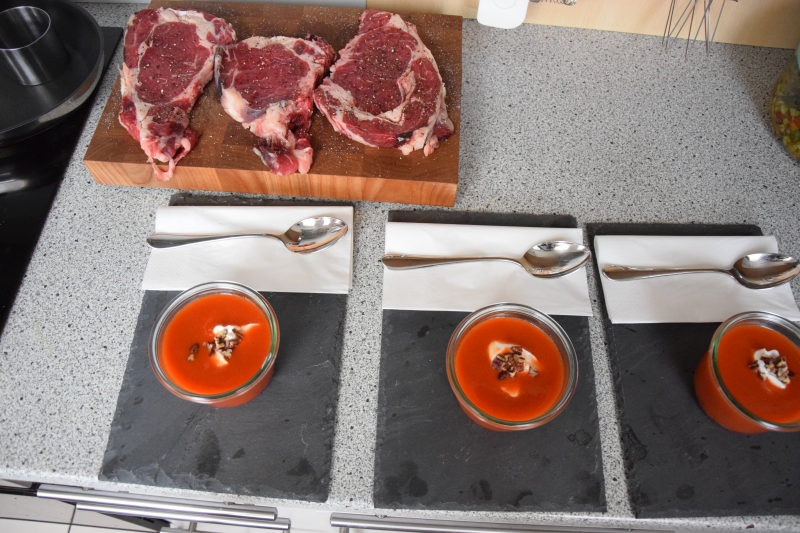 Für das Steak das Rib-Eye salzen und pfeffern. Nach 30 Minuten auf dem Grill bei milder Hitze 30 Minuten grillen. Zum Ende hin aufdrehen, sodass das Steak Farbe bekommt. Ruhen lassen.