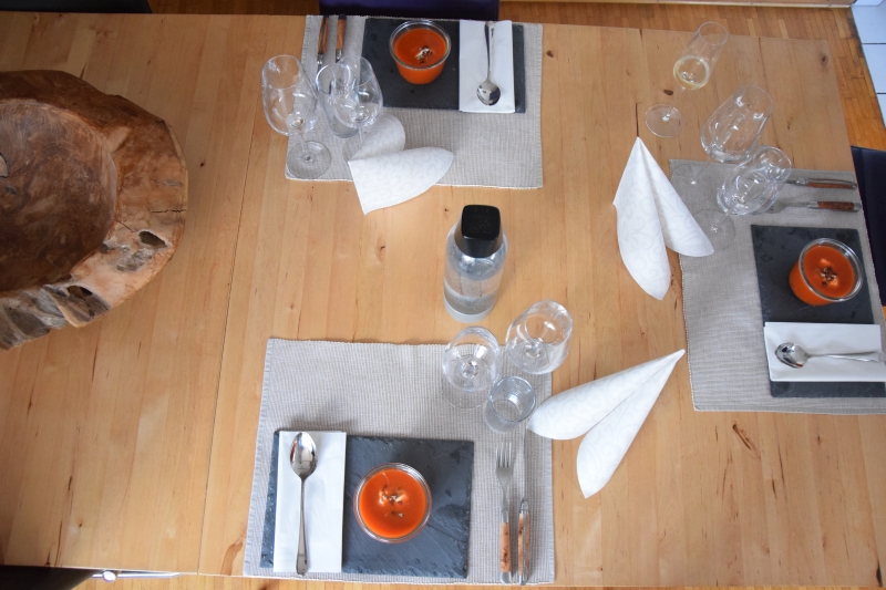 Als Vorspeise gab es die kalte Paprikasuppe. Als Nachspeise Tartelettes mit Waldbeeren (Alain Ducasse/Frédéric Robert „Grand Livre de Cuisine: Desserts und Patisserie“, Matthaes Verlag, 2007, S. 136). Danach einen Eiskaffee mit Vanille.