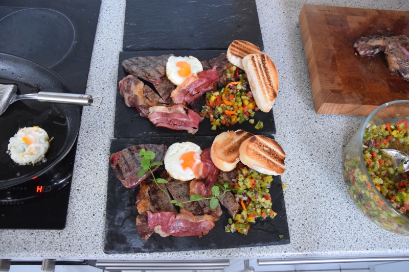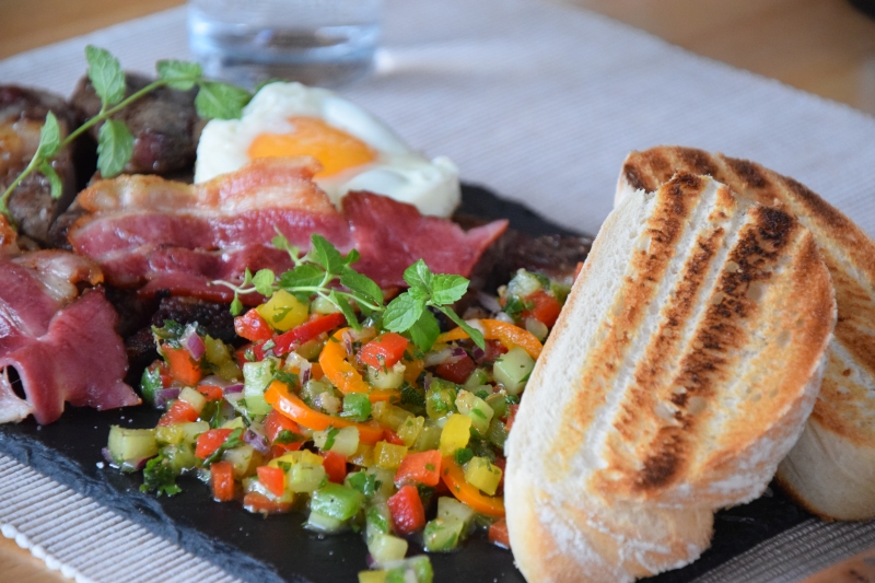 mit Paprika-Gurken-Salsa. Dazu gebratene Kalbsleber, gebratenen Bauchspeck und ein Spiegelei.