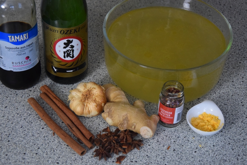 Für die asiatische Meisterbrühe eine Hühnerbrühe machen. Hühnerbrühe, Reiswein, Ingwerwurzel, Knoblauchzehe, Zimtstange, Orangia Sun, Sichuan-Pfefferkörner, Sternanis und den SukrinMelis-Puderzucker in einem Topf aufkochen und 30 Minuten köcheln lassen. Durch ein Sieb passieren. Entfetten. Auskühlen lassen.