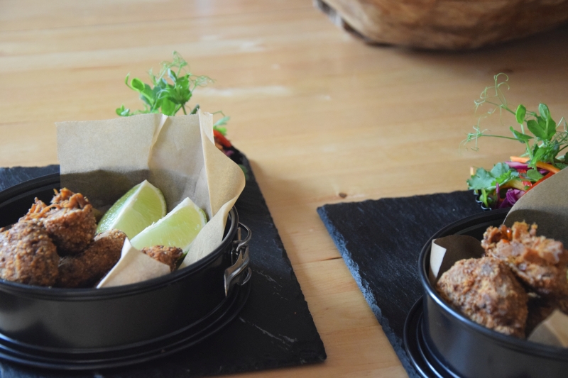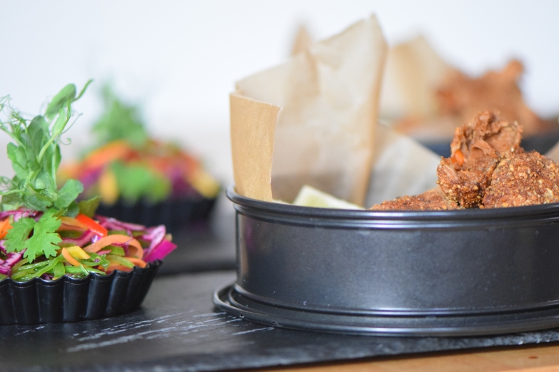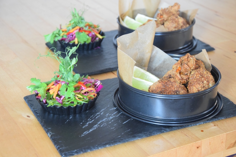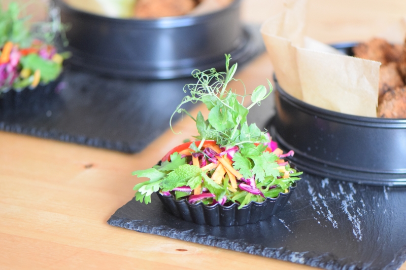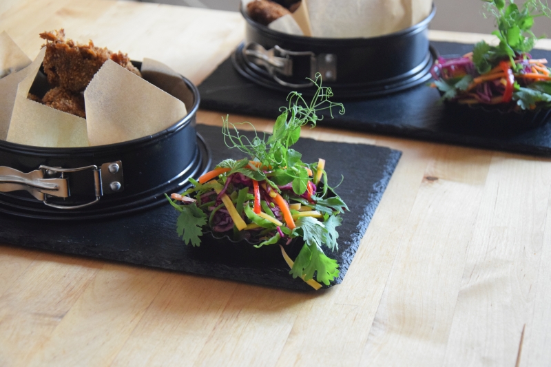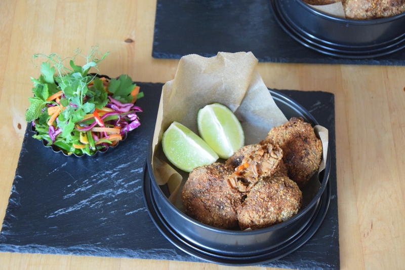 Kalbsfleischkroketten mit asiatischem Krautsalat. Für die Kroketten wurde eine Kalbsbrust so lange im Ofen gegart, bis sie ganz zart war. Sie wurde in einen Sud eingelegt, den man im NOPI-Restaurant Meisterbrühe nennt.