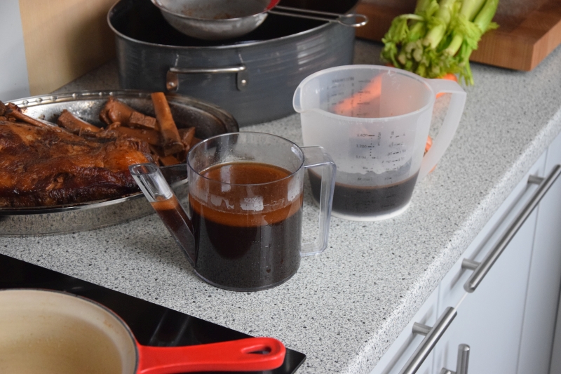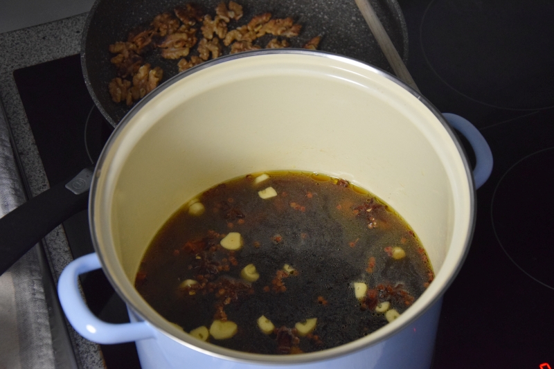 Die Liste der Zutaten der Meisterbrühe liest sich wie ein Katalog von Scullys Favoriten, so schreibt Ottolenghi im NOPI-Kochbuch. Da haben wir gleich etwas mehr gemacht und den Rest eingefroren. Die Meisterbrühe kommt auch noch in einem anderen Rezept von Ottolenghi/Scully vor.