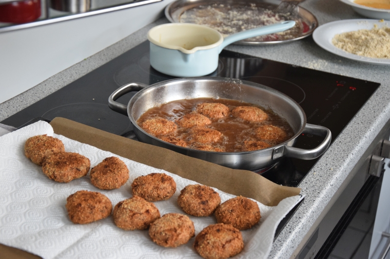 Die Panade mit dem teilentölten Mandelmehl und den geriebenen sizilianischen Mandeln haben wir im Rezept, siehe oben, genau aufgeschrieben. Wir glauben, dass uns da eine paleotaugliche Panade gelungen ist, die bröselig und trocken ist.