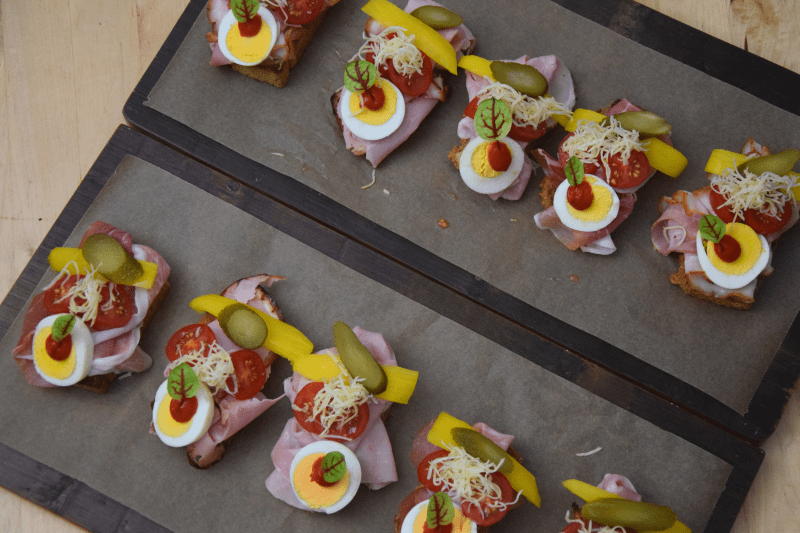 Heute nur kalte Küche, selbstgemachtes Brot aus grobem Manioka-Mehl (Gari) belegt mit Schinken, Kümmelbraten, Tomaten, Mini-Salzgurken, hartgekochtes Ei und Kren. Darauf Senf und Paprikacreme, garniert mit Blutampfer.