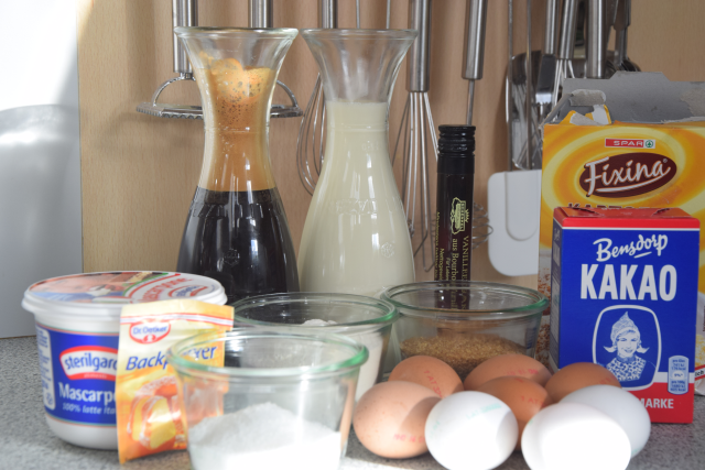 Für die Mascarponecreme alle Zutaten vermischen und aufschlagen, bis die Masse eindickt. Die Hälfte mit 3 EL Espresso vermischen.