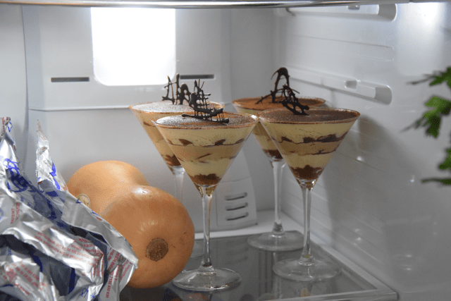 Im Glas aufschichten: Zuunterst eine Lage mit den kaffeegetunkten Biskotten, dann Mascarponecreme ohne Espresso aufschichten, mit Kakaopulver bestäuben und mit Schokoscheibe belegen. Diese Schichten wiederholen, abwechselnd mit Mascarponecreme mit und ohne Espressogeschmack. Zum Schluss mit Kakaopulver bestäuben und mit Schokogitter garnieren.