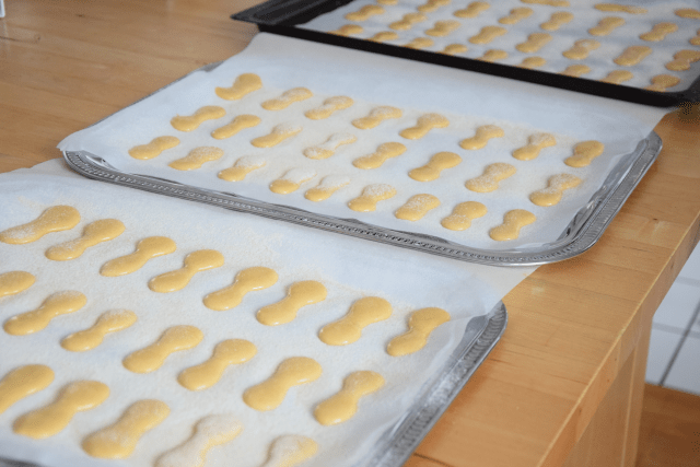 In einen Dressierbeutel geben und auf ein mit Backpapier ausgelegtes Backblech spritzen. Die klassische Form hat am Beginn und Ende eine löffelförmige Verdickung.