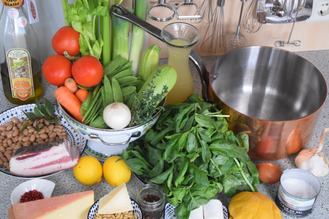 Pestosuppe à la Ducasse. Und Zitronen-Ziegenkäse-Ravioli à la Ottolenghi.