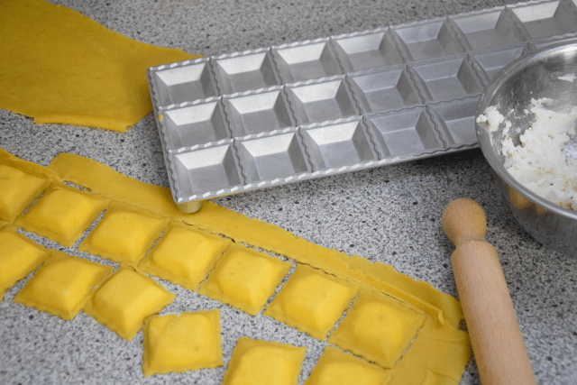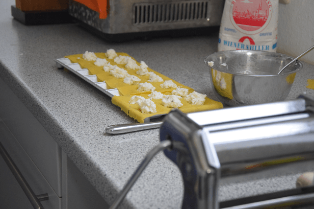 In vier Teile teilen. Durch die Nudelmaschine drücken. Auf die Ravioliform legen. 1 TL Füllung darauflegen. Mit dem zweiten Teig abdecken. Mit dem Nudelholz durchwalken. Die fertige Ravioli auf ein bemehltes Küchentuch legen und 15 Minuten trocknen lassen