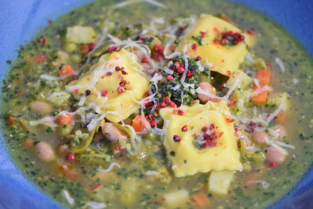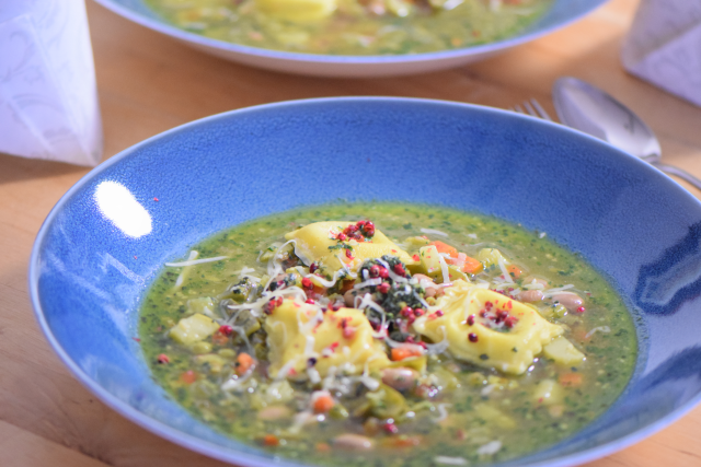 Das Pesto kurz vor dem Servieren in die Suppe rühren. Mit hausgemachten Ravioli servieren und mit Rosapfeffer bestreuen. Sowie geriebenem Hartkäse.