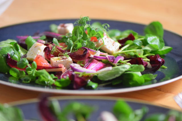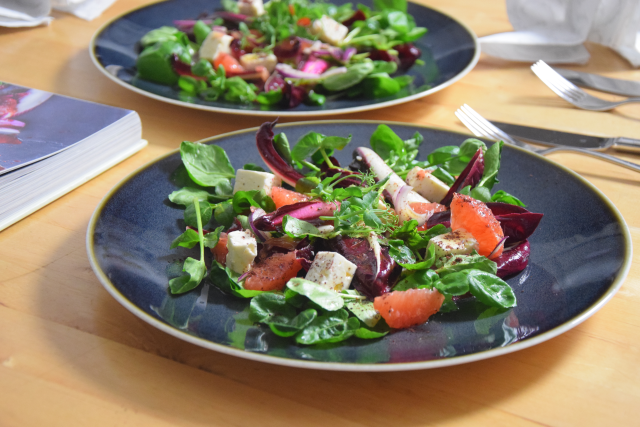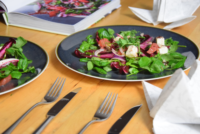 Vom Radicchio die Blätter abzupfen, große halbieren, eine rote Zwiebel in dünne Scheiben schneiden. Schafkäse würfeln. Radicchio, Zwiebel, Grapefruit-Filets und Schafkäse in einer Schüssel mit der Hälfte des Dressings verrühren. Brunnenkresse und Radicchio-Mischung auf den Teller legen.