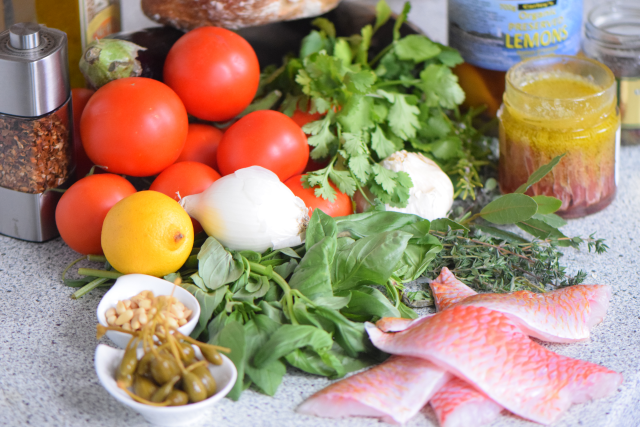 Eine Scheibe Brot mit Auberginenpüree, eine mit Tomatenconcassée und eine mit Tapenade einstreichen und jede Scheibe mit einem Stück vom Rotbarbenfilet belegen. Die konfierten Tomaten mit Kräuterblättern, Kapernfrüchte und mit fein gehackten in Salz eingelegten Zitronenschalen sowie Pistou dekorieren.