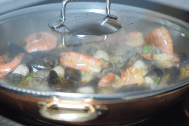 Was macht man, wenn man von einem Rezept abgekommen ist, für das man bereits die frischen Zutaten besorgt hat, die rasch zu verbrauchen sind? Man macht eine Paella. Hier passt zwangsläufig nicht alles rein, aber die Miesmuscheln, Herzmuscheln und Venusmuscheln, die wir eingekauft hatten, schon.