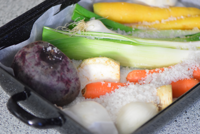 Grobes Meersalz in einer Kokotte großzügig verteilen. Gewaschene, getrocknete, aber nicht geschälte Karotten, gelbe Rüben, rote Bete, Petersilienwurzel, Pastinaken, weiße Zwiebel, Lauch, Frühlingszwiebel auf das Salzbett legen. Mit Salz ganz bedecken. Zugedeckt in den Ofen schieben.