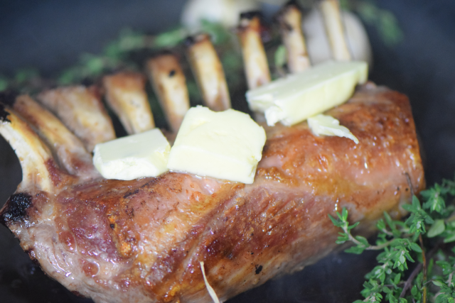 Das Lamm im Ganzen in brauner Butter auf allen Seiten goldbraun anbraten, Herd zurückdrehen. Dann Butter, Thymian, zerdrückte Knoblauchzehe dazu geben. Mit der Butter aromatisieren. Vom Herd nehmen. Ruhen lassen.